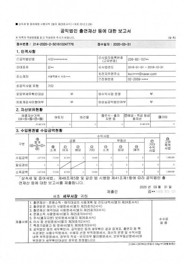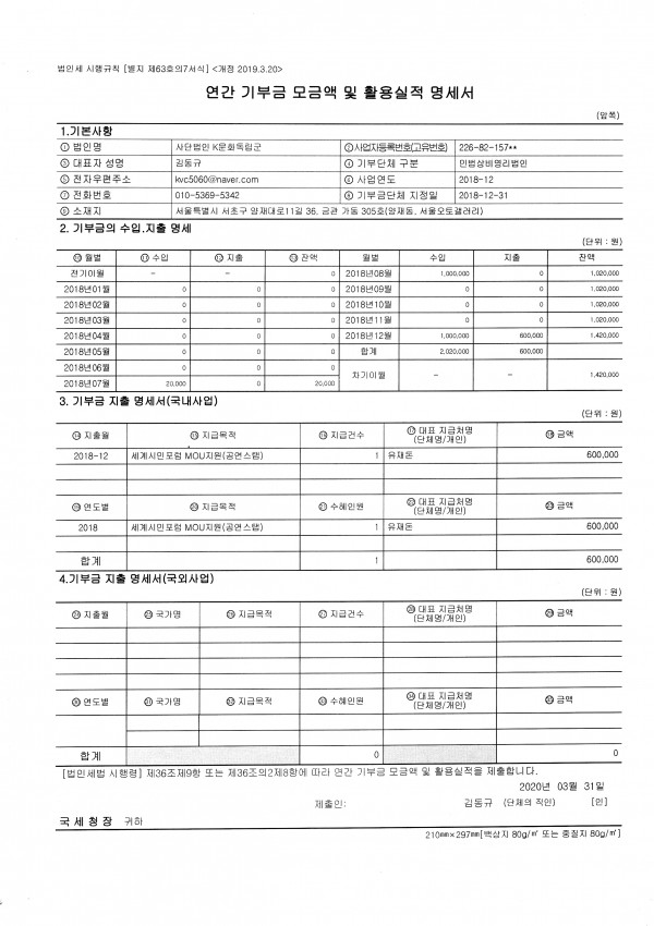 2018 연간기부금 모금액 및 활용실적 명세서 / 공익법인 출연재산 보고서 페이지 정보 관련링크 이전글 목록 본문 2018 연간기부금 모금액 및 활용실적 명세서 2018 공익법인 출연재산 보고서 이전글 목록