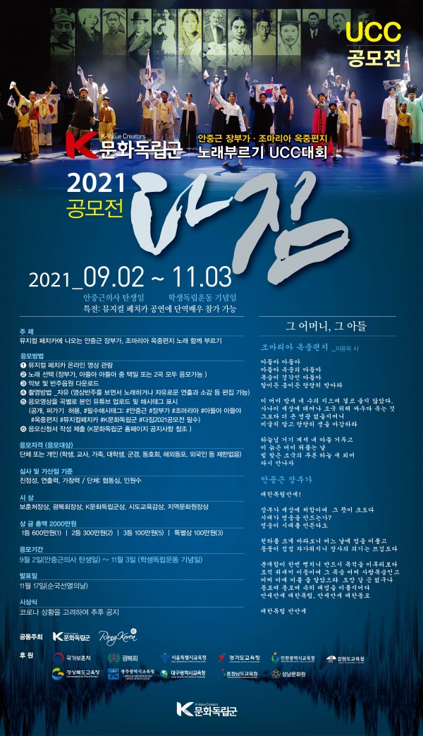 2. 필수 해시태그 삽입: #안중근 #장부가 #조마리아 # 아들아아들아 #옥중편지 #뮤지컬페치카 #K문화독립군 #다짐2021공모전 #신청자(개인,단체)